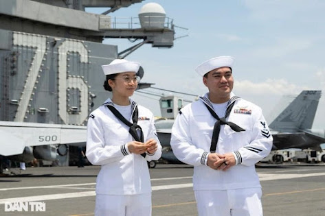 Ảnh 1: Nữ thủy thủ gốc Việt Đoàn Nhật Huyền Trân (23 tuổi) đang phục vụ trên hàng không mẫu hạm USS Ronald Reagan hiện cập cảng Đà Nẵng